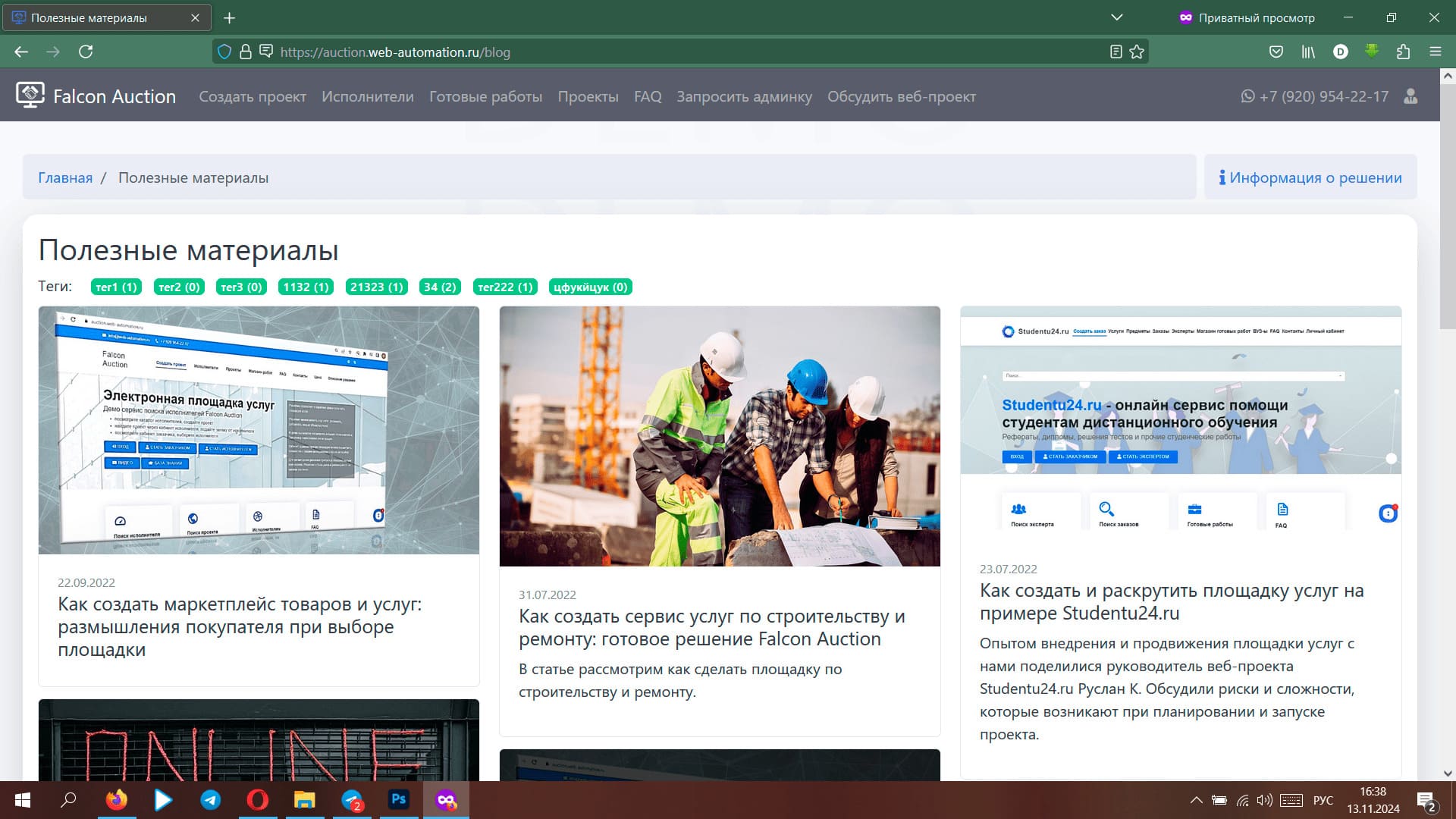 Блок контента позволяет размещать материалы для пользователей и создать дополнительный источник трафика на площадку через контент. Размещение статей идет через текстовый редактор Richeditor. Предусмотрены все настройки для оптимизации SEO/