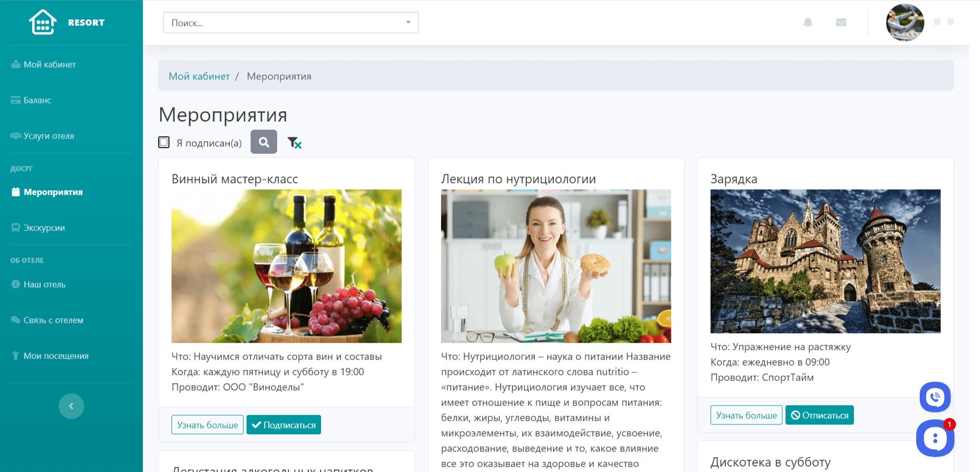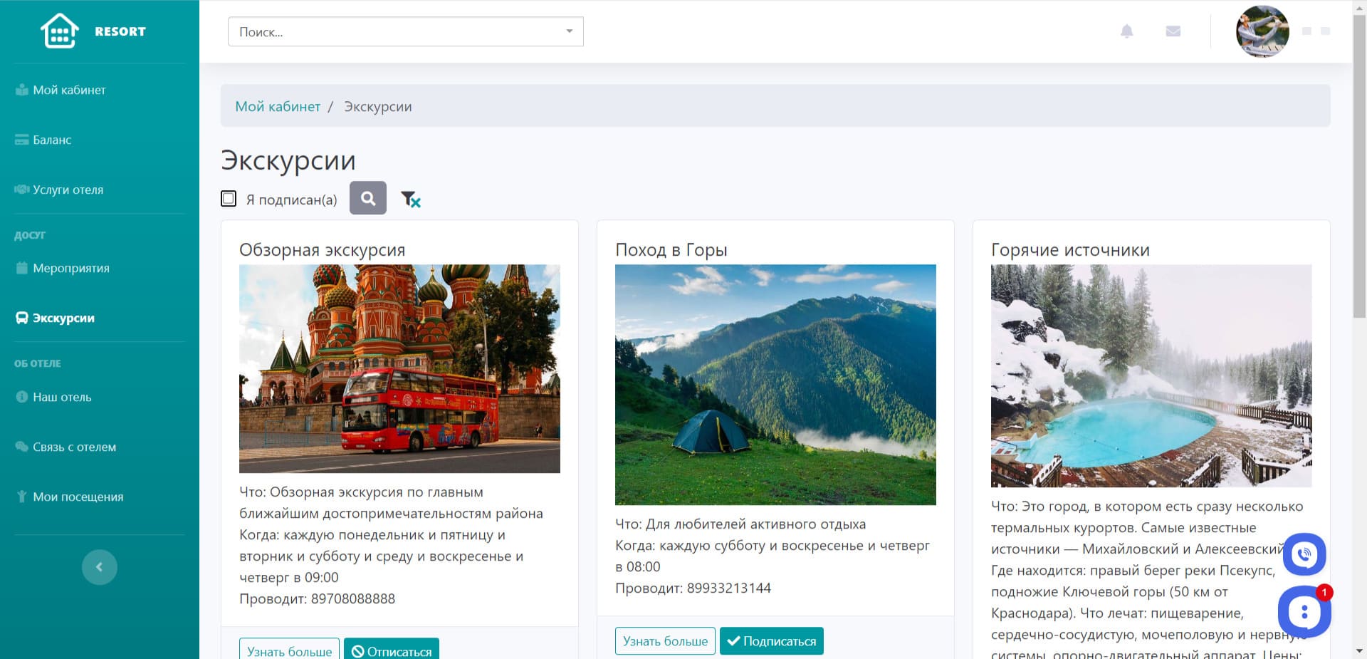 Личное пространство для клиентов отеля или гостиницы, в котором они могут заказывать услуги отеля, писать обращения, записываться на мероприятия и экскурсии. А также управлять заказами, обращениями и записями с помощью дашбордов.