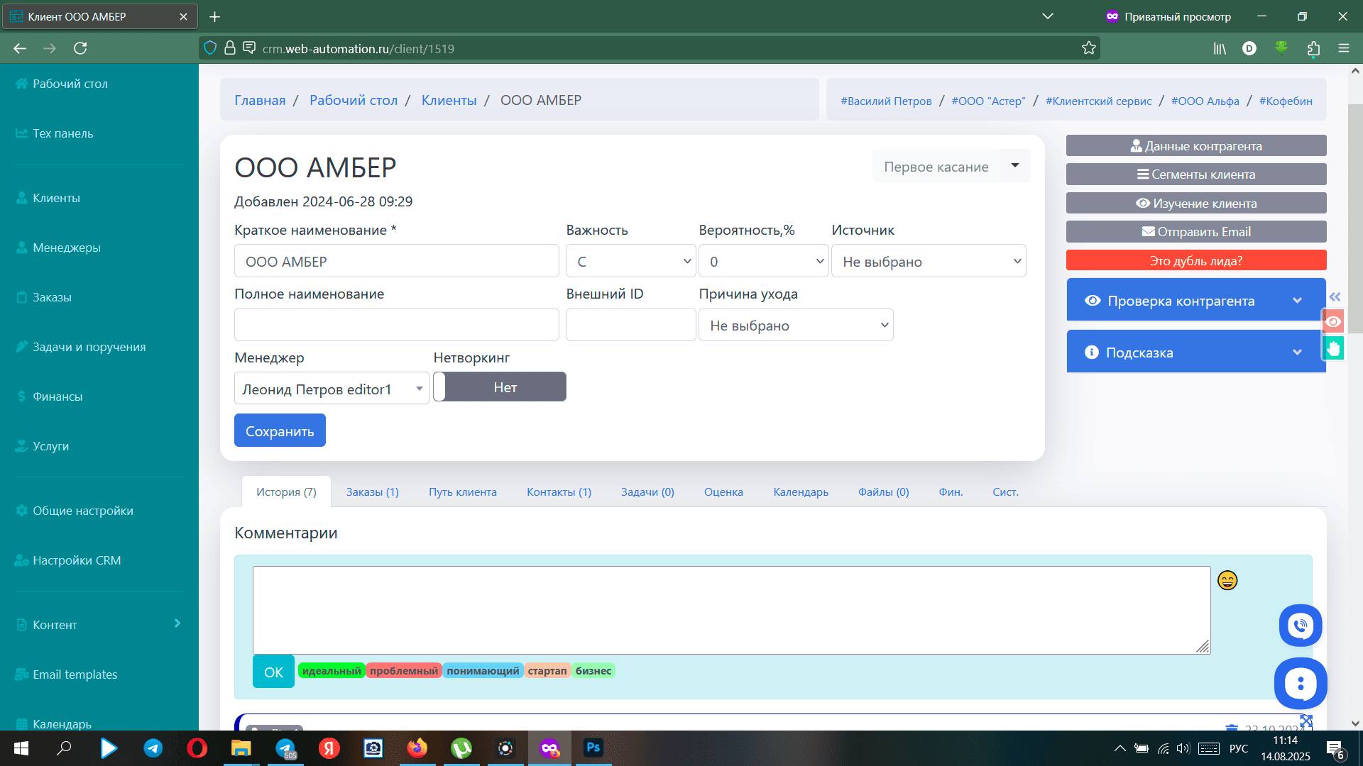 CRM хранит всю информацию о клиенте в одной карточке: контакты, историю покупок, переписку и предпочтения. Это помогает персонализировать общение, быстрее обрабатывать запросы и не терять данные при смене сотрудников.