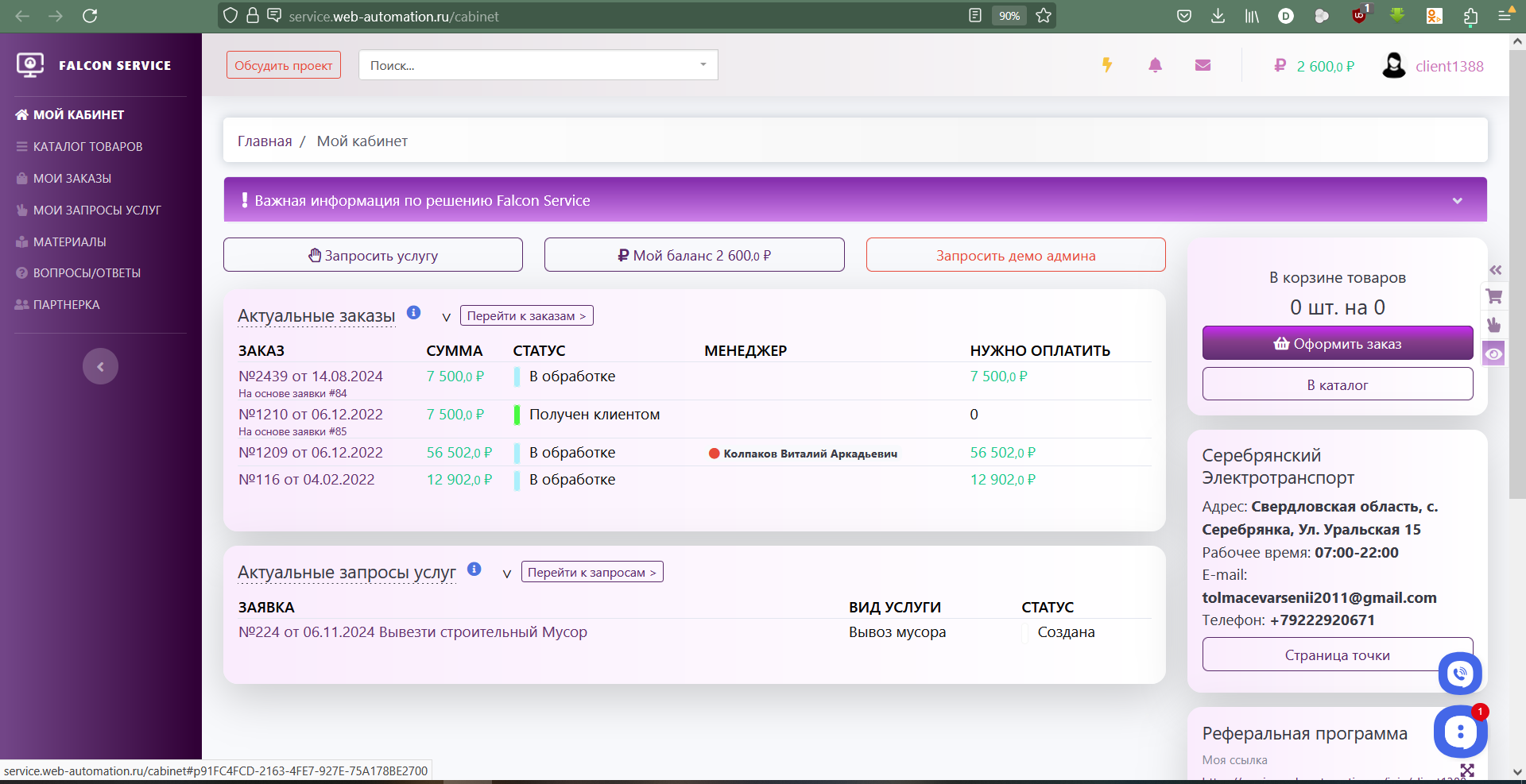 Например, так может выглядеть личный кабинет клиента в готовом решении Falcon Service: