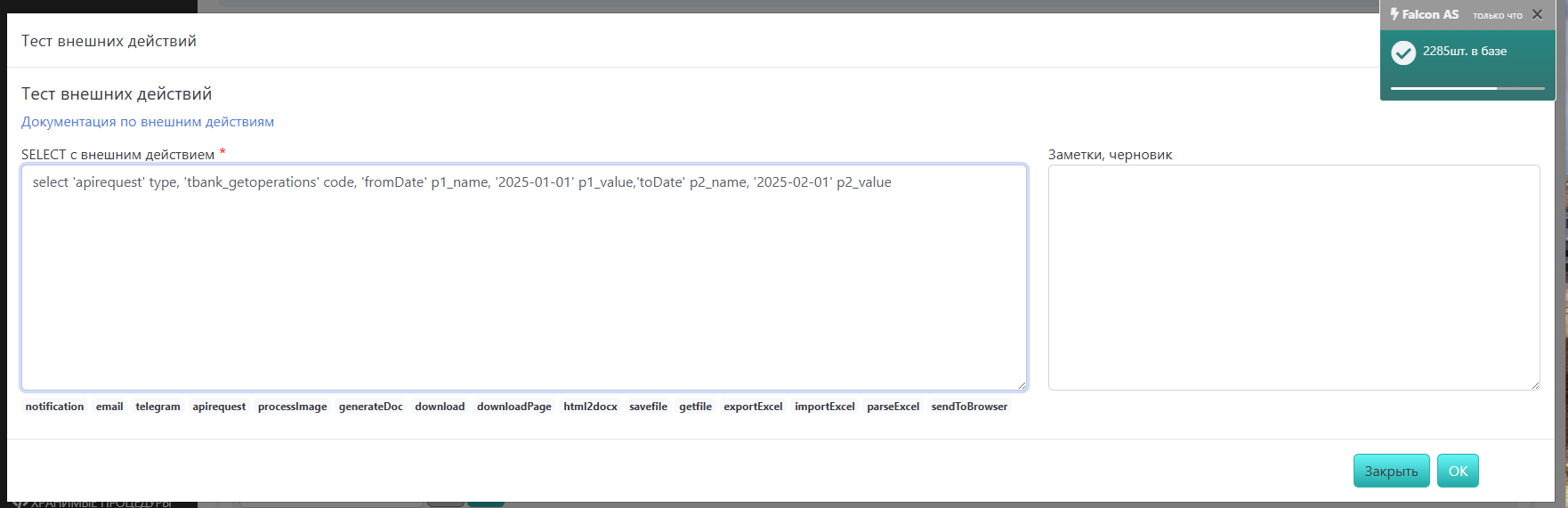 6. Проверяем как работает метод через инструмент вызова внешнего действия на /asapi