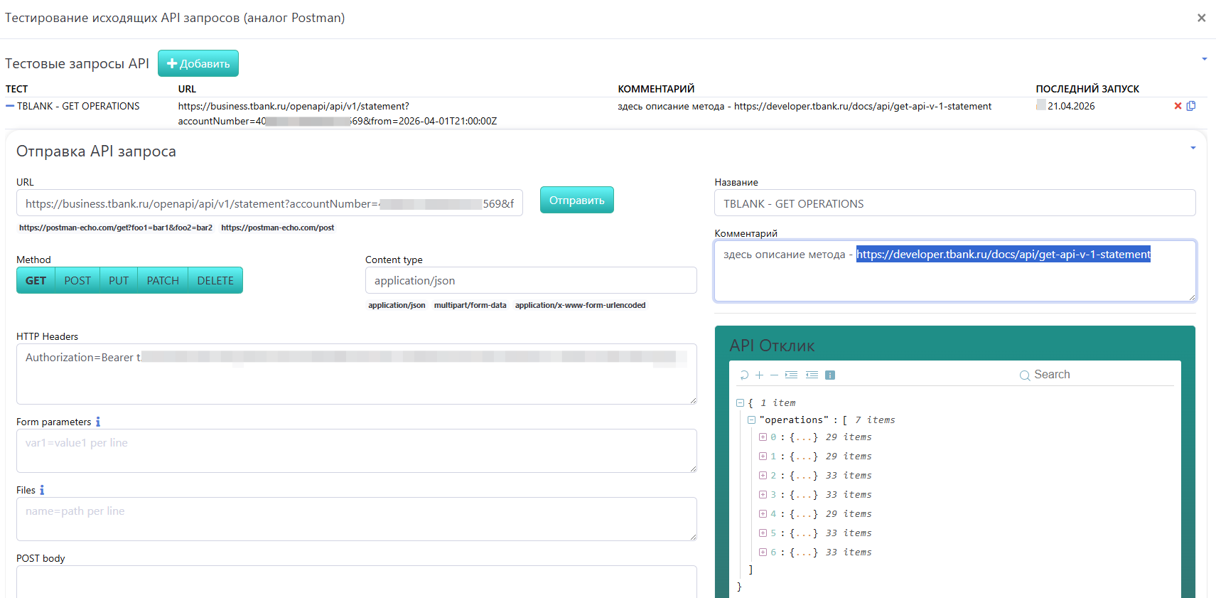5. Теперь создаем исходящий метод API, который будет запрашивать данные в Тбанк и сохранять их в таблице. Код - tblank_getOperations.