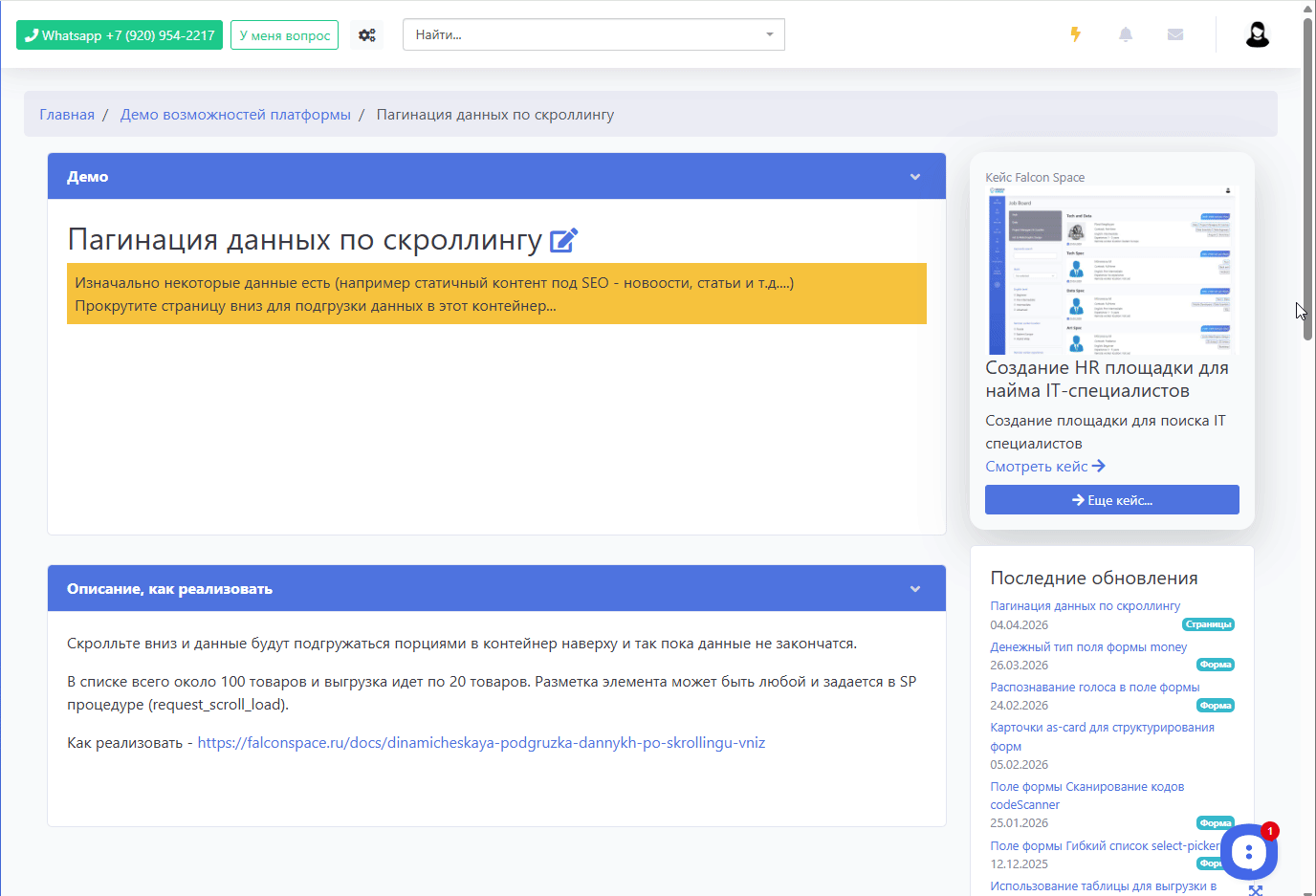 Новая возможностьДемостенд как работает - https://demo.falconspace.ru/list/watch/paginaciya-dannykh-po-skrollingu---1179