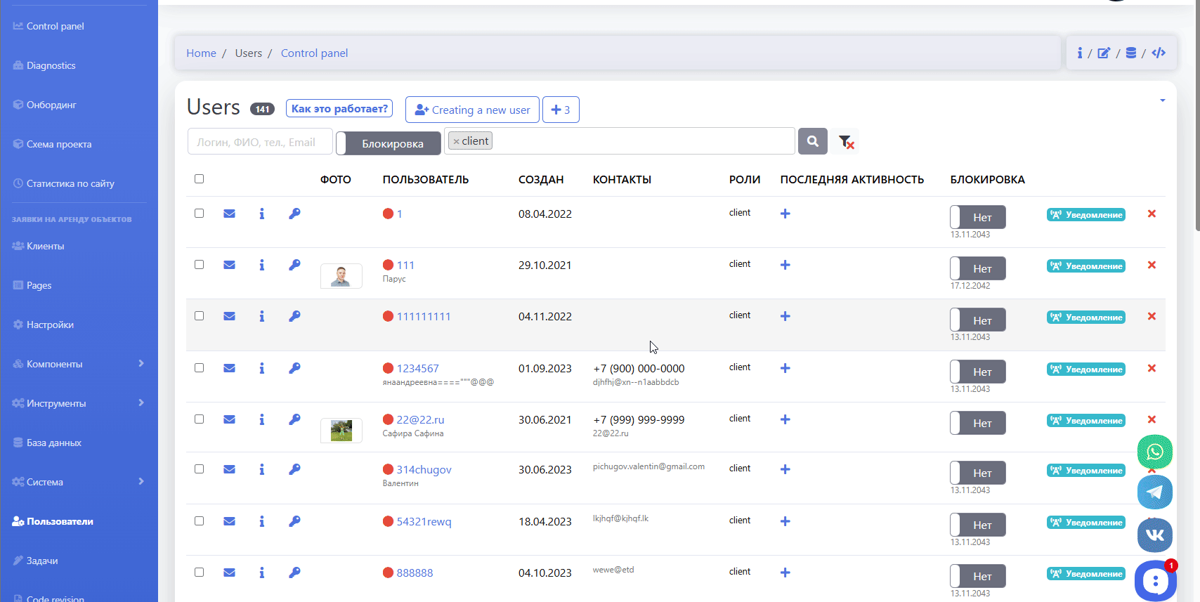 - уведомления админов о регистрации